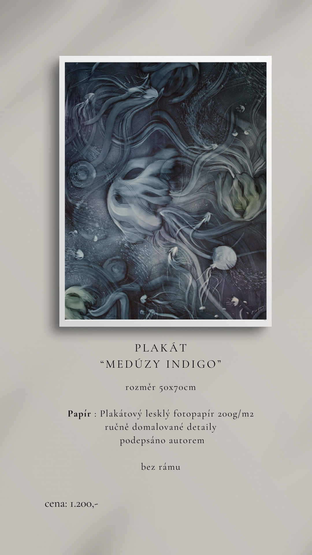 Domalovaná reprodukce originálu akvarelového velkoformátu Medúzek v odstínech indigo na vysokogramážním plakátovém fotopapíře.