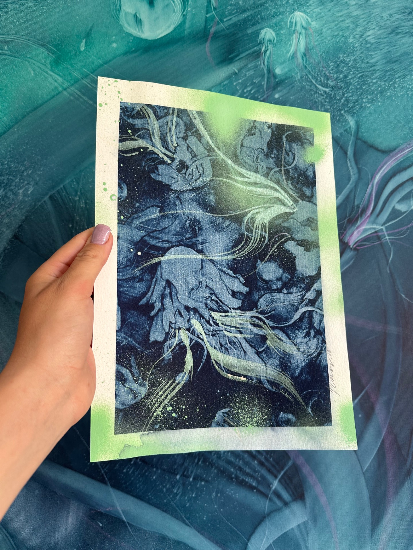 Velkoformáty originálních akvarelových MEDÚZ přenesené pomocí historické fotografické techniky s názvem KYANOTYPIE (modrotisk, železitý tisk)