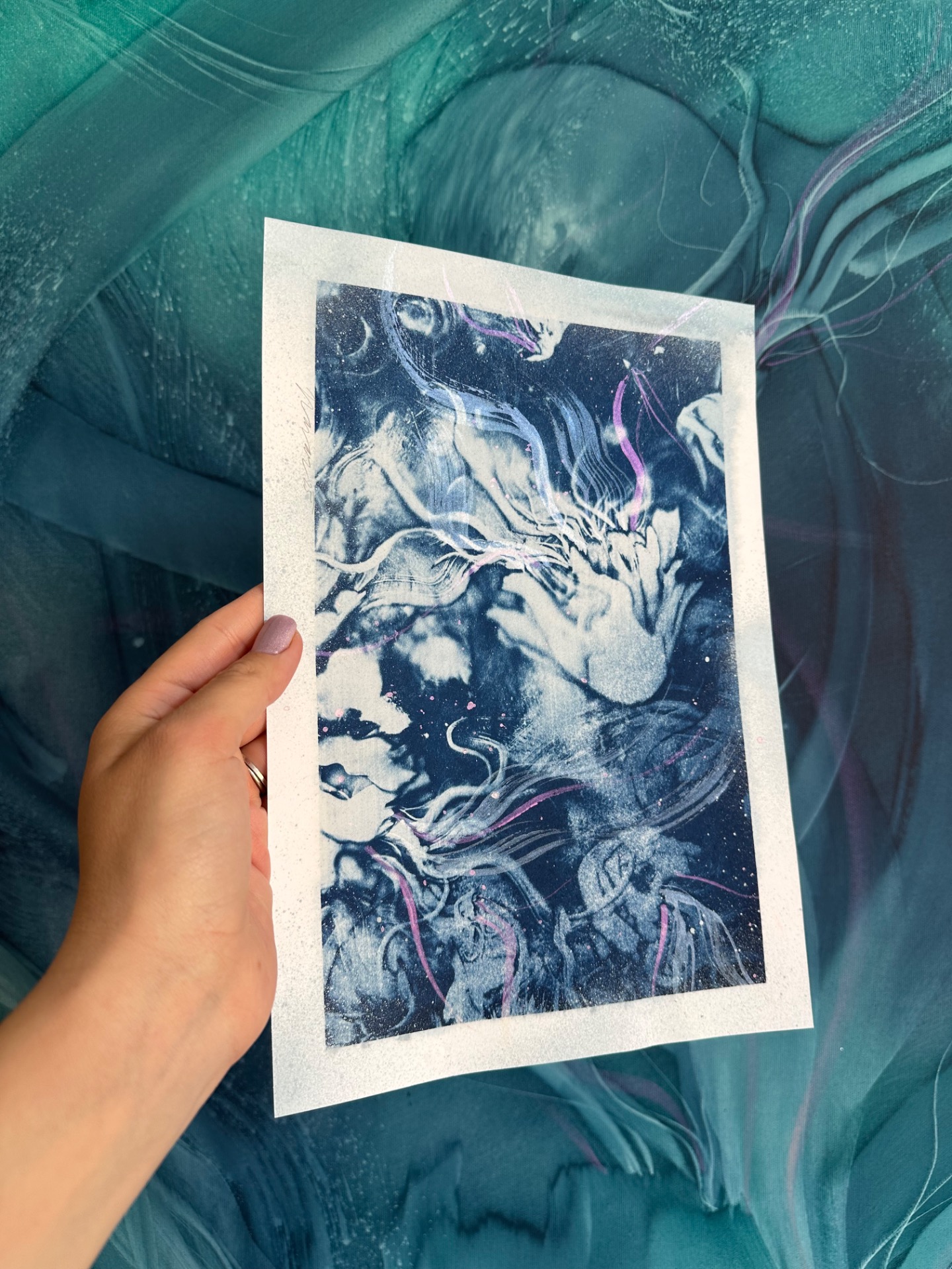 Velkoformáty originálních akvarelových MEDÚZ přenesené pomocí historické fotografické techniky s názvem KYANOTYPIE (modrotisk, železitý tisk)